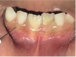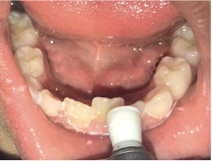 En el examen clínico intraoral, se observó dentición mixta, todos los dientes limpios, sin embargo, con maloclusión, por esa razón el paciente fue referido para evaluación y tratamiento ortopédico. Conforme la mamá había reportado, los incisivos laterales primarios inferiores estaban en oclusión (Figura 1) y sin movilidad. A través de la radiografía periapical en la región de los incisivos laterales inferiores (Figuras 2 y 3), fue observado que los gérmenes de los incisivos laterales inferiores permanentes se encontraban en la etapa 8 de Nolla, entonces, deberían estar estallando en la cavidad oral.