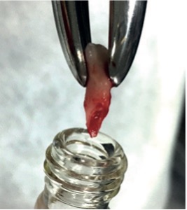 Para el inicio del procedimiento del cultivo primario, los dientes fueron lavados 5 veces con PBS a 2% del antibiótico y antimicótico (Sigma®) (Figuras 9 y 10). Primeramente, fue retirada la papila apical utilizando pinza clínica. Y por fin, la remoción de la pulpa dentaria fue realizada a través del foramen apical utilizando lima Kerr número 15.